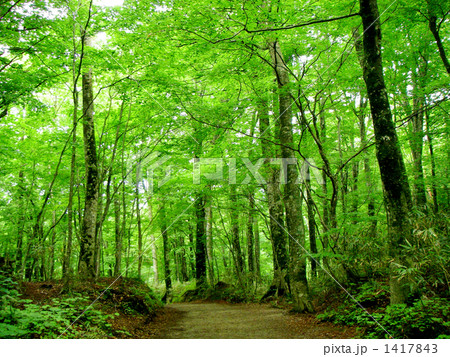 緑の葉が生い茂る森の中の木漏れ日の写真素材
