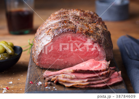 Roast beef on cutting board. Wooden background.