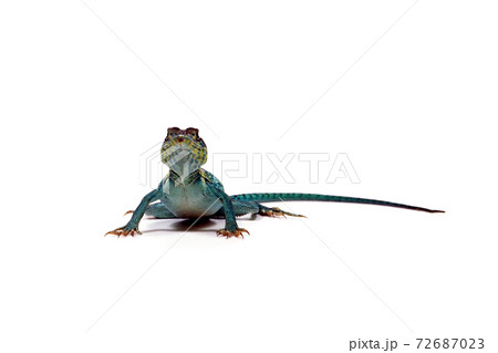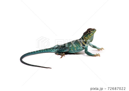 白バックで捉えたエキゾチックなトカゲの全身像「