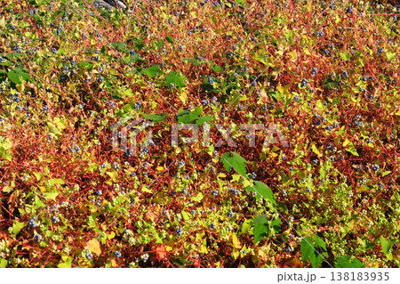 秋の畑脇の廃棄物置き場に生える実を付けたイシミカワ