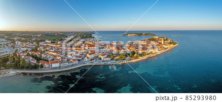 Drone panorama of Croatian coastal town Porec with harbor and promenade during sunrise