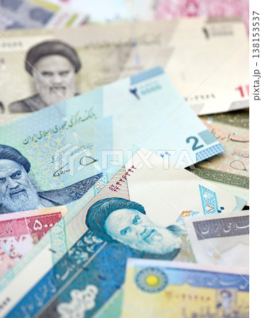Iranian rial money bills pile on table. Iran banknotes of IRR currency close up. Concept of business, economy and banking in Iran