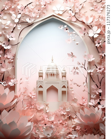 mosque and blossom flowers in paper cutting style 3D illustration. Ramadan kareem and eid fitr islamic concept background for greeting card and flyer. colorful pastel color.