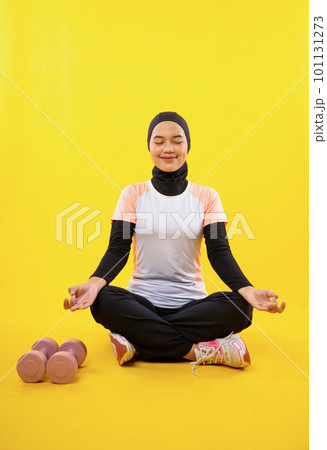 Muslim woman with gyan mudra smiling in bean bag on roof