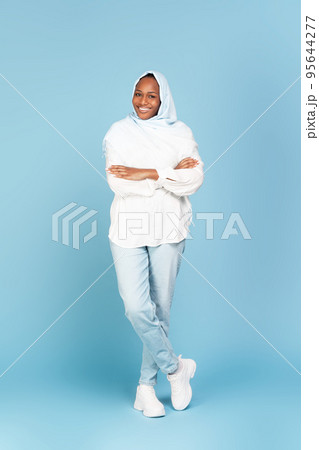 Full length portrait of smiling african american muslim woman in headscarf posing with folded arms over blue background