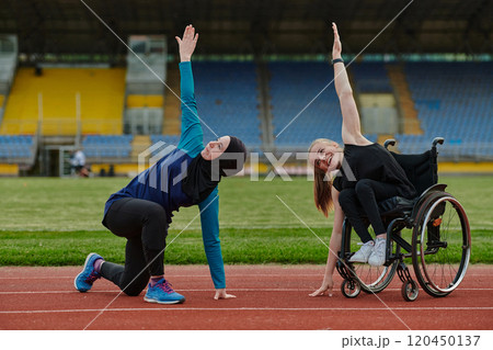 Two strong and inspiring women, one a Muslim wearing a burka and the other in a wheelchair stretching and preparing their bodies for a marathon race on the track