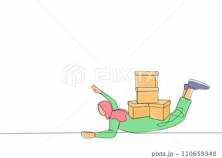Continuous one line drawing Arab businesswoman under heavy pile of box burden. Overworked man with stacks of cardboard. Stress at work. Bureaucracy. Single line draw design vector graphic illustration