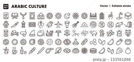 中東、アラブ文化のアイコンセット(細線・ベクター素材) イスラム文化、食、観光向けベクター素材