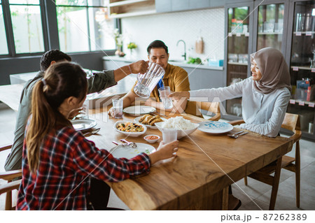 muslim asian family take selfie during iftar dinner preparation