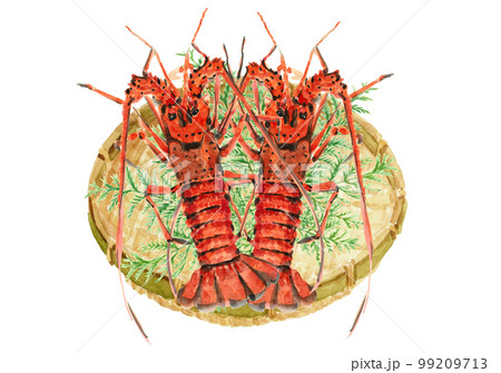 ザルに盛った伊勢海老2尾のイラスト【手描き水彩画】白バック 透過背景