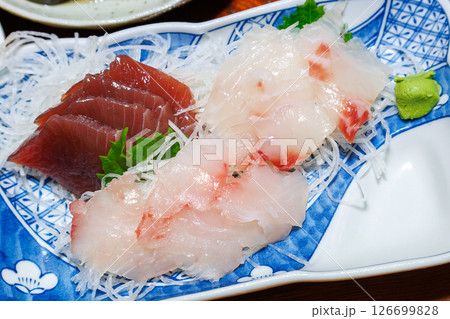 メイチダイ、キハダマグロの刺身。民宿の美味しい晩ごはん。 ヒリゾ浜中木南伊豆町伊豆半島静岡県2024