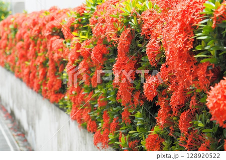 道端に咲く赤い花サンダンカ 夏風景