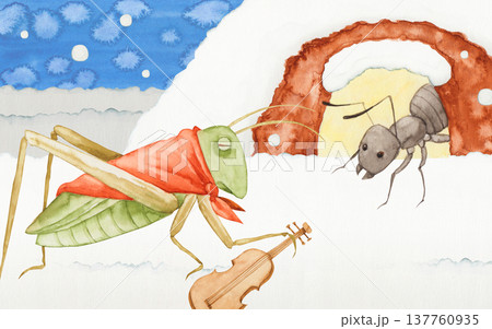 イソップ寓話 アリとキリギリス 水彩 イラスト