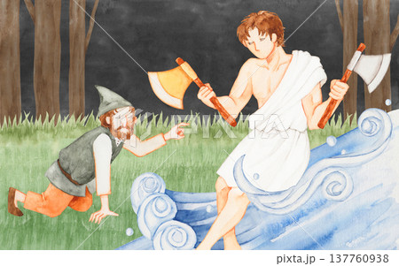 イソップ寓話 金のオノ銀のオノ 水彩 イラスト