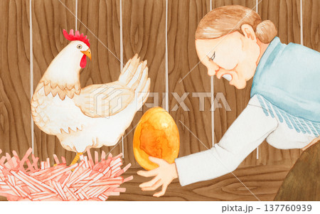 イソップ寓話 ver2 金の卵を産むニワトリ 水彩 イラスト