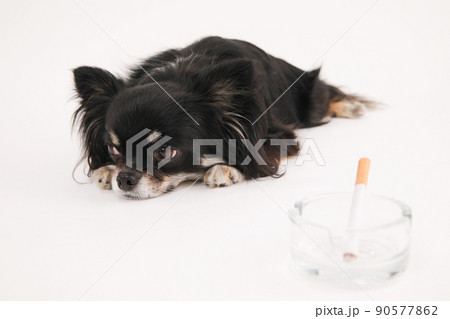 灰皿に入ったタバコの横でフセをするブラックタンのロングコートチワワ