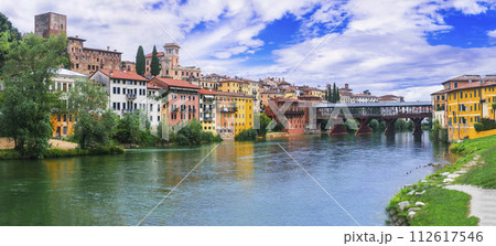 Beautiful medieval towns of Italy -picturesque Bassano del Grappa .Scenic view with famous bridge. Vicenza province, region of Veneto.