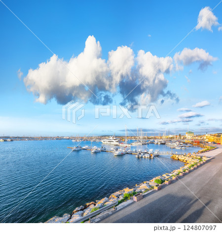 Unbelivable summer view of the Alghero Marina yacht port at the Gulf of Alghero with anchored sailboats.