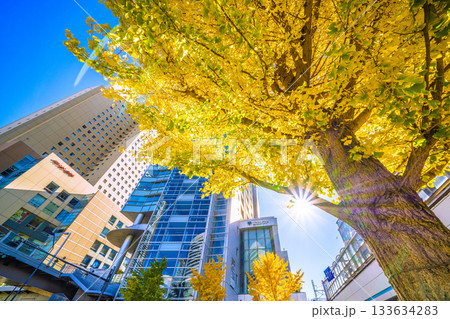 日本の横浜都市景観 師走…美しい黄色の絨毯だが、滑りやすので注意が必要…=横浜市のセンター北駅前で