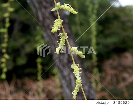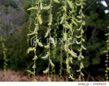 自然 植物 シダレヤナギ、花のついた細い枝が春のやわらかい風に揺れています