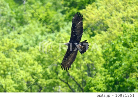 グリーンバックに獲物を探して悠然と飛ぶ若いイヌワシ