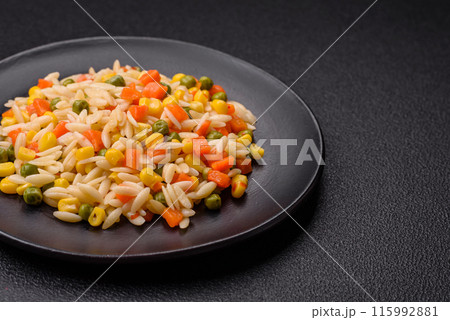 Delicious boiled rice with vegetables corn, carrots, peas with salt