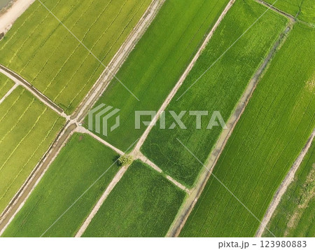 Rice field cultivation action rural landscape agricultural environment aerial view sustainable farming concept