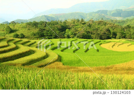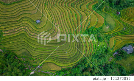 Aerial top view Rice fields on terrace northern Vietnam, Rice fields prepare the harvest at northwest vietnam,Wide angle view