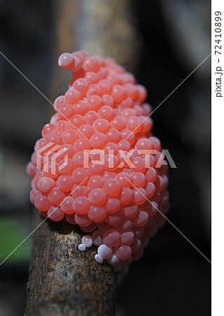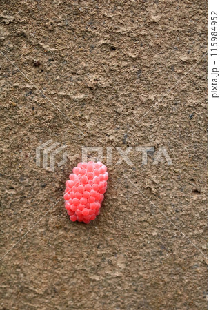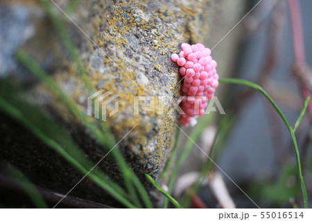 ジャンボタニシの鮮やかなピンク色の卵塊