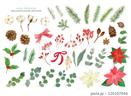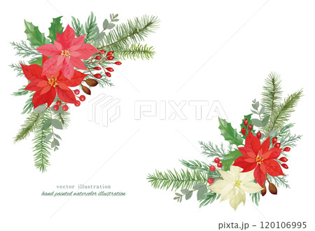 ポインセチアと針葉樹のクリスマスのベクターイラスト