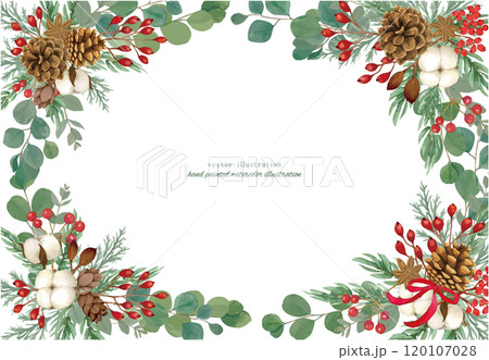 松ぼっくりとコットンフラワーのクリスマスのベクターイラストフレーム