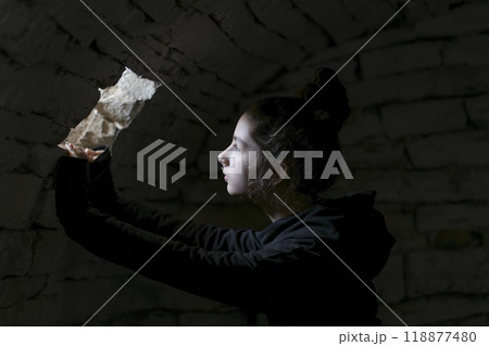 Young adult in a basement looking in a small window. A beam of light falls on her face. Portrait of the young girl in the dungeon with dark background.