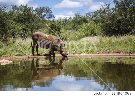Common warthog along waterhole with reflection in greater Kruger National park, South Africa ; Specie Phacochoerus africanus family of Suidae