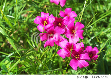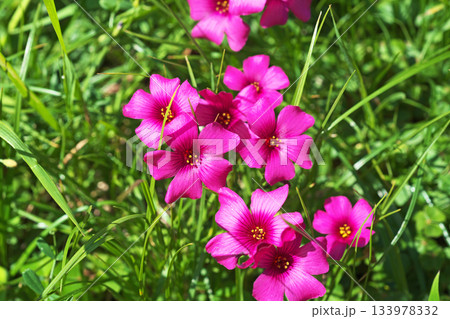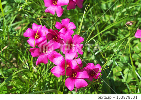 新緑の中で鮮やかに咲くピンク色のイモカタバミ
