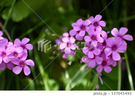 イモカタバミのピンクの花・春の野草の鮮やかなクローズアップ