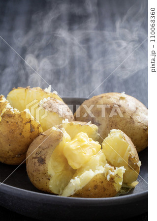 じゃがバター、湯気を上げるジャガイモ、溶けるバター