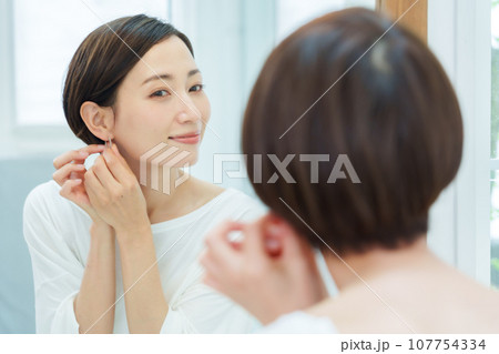 メイクルームでピアスを付ける女性