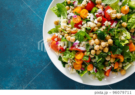 Tabbouleh salad. Tabouli salad with fresh parsley, onions, tomatoes, bulgur and chickpea. Healthy vegetarian food, mediterranean diet. Top view