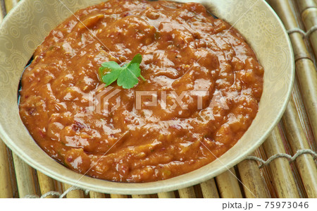 homemade muhammara in a brown earthenware bowl.