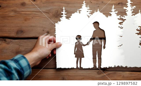 Paper cutout of a father and daughter holding hands, set against a wooden background for a heartfelt Father's Day theme
