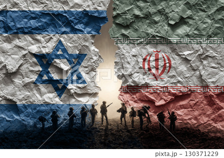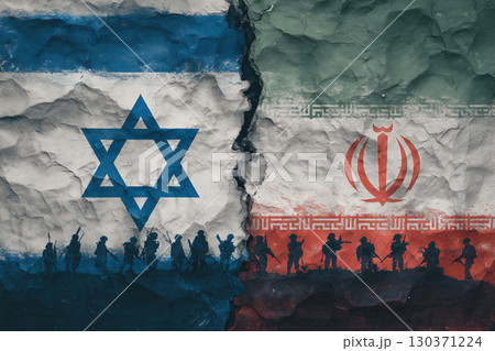 Israel vs Iran war with political, economic and diplomatic tense relations as a cracked wall separates the national flags. Geopolitical conflict and disputes between Jerusalem and Tehran
