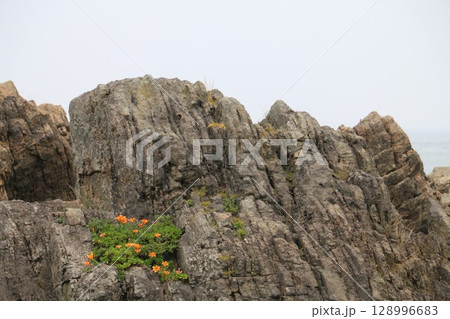 日本海 笹川流れ 岩に咲くイワユリ