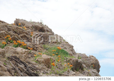 日本海 笹川流れ 岩に咲くスカシユリ