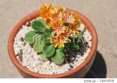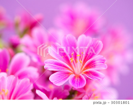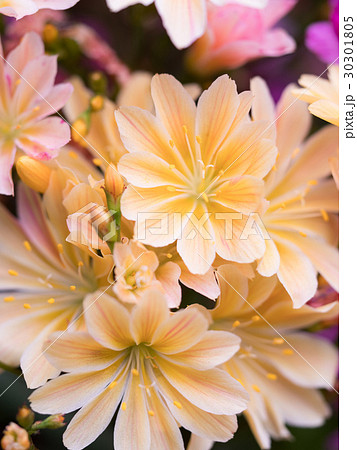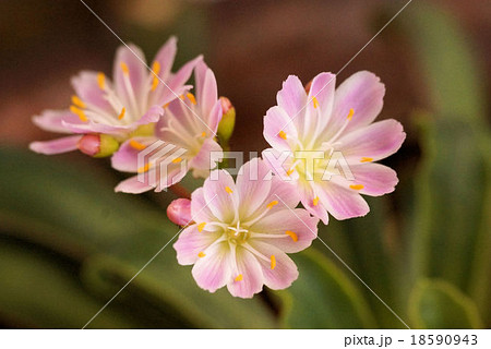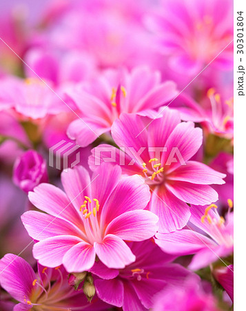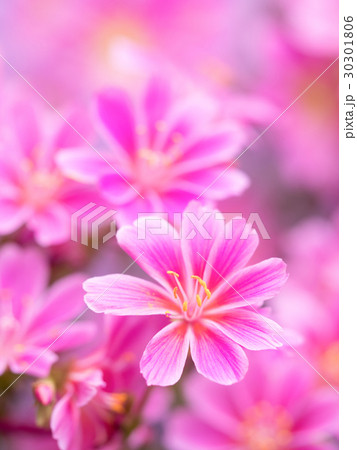 レウイシア、次から次へと咲き続ける。乾燥に強く、多湿に弱いが、育てやすい。青空。花イメージ素材