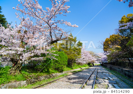 京都・蹴上インクラインの桜並木と廃線跡の風景