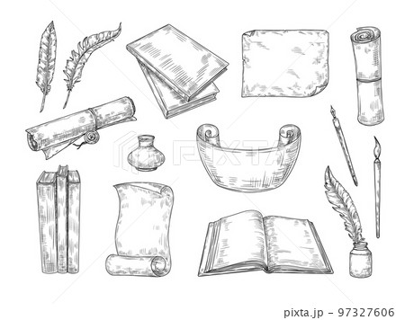 Sketch literature writing. Vintage writers quill ink pen, poem book and manuscript papers scroll. Hand drawn literature vector set