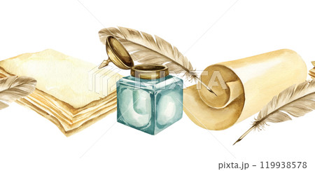 seamless board with feather quill dip pen and vintage green glass inkwell, stack of old brown paper, aged scrolled papyrus, watercolor illustration of historical theme, antique devices for writing