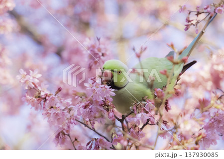 桜の花とワカケホンセイインコ(輪掛本青鸚哥)