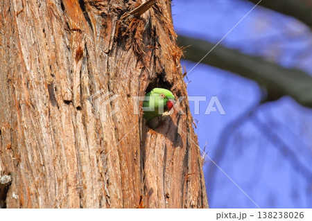 飛翔する美しいワカケホンセイインコ(インコ科)東京都文京区-2024年