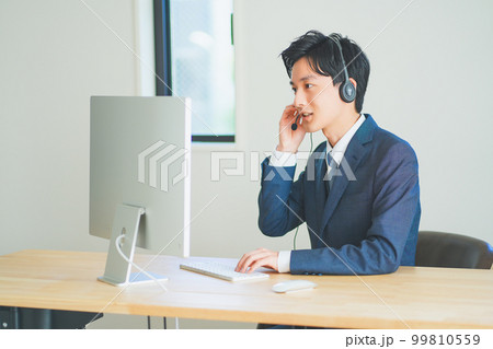 ヘッドセットをつけてインサイドセールスをするスーツ姿の若い男性